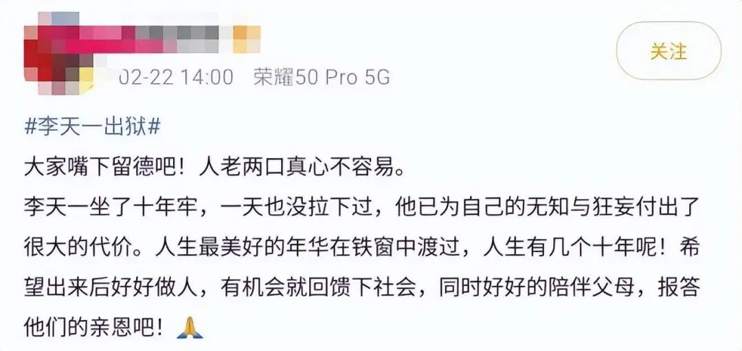 李天一年少轻狂犯下大错,他用十年宝贵青春去赎罪反省,已经付出了巨大的代价。
