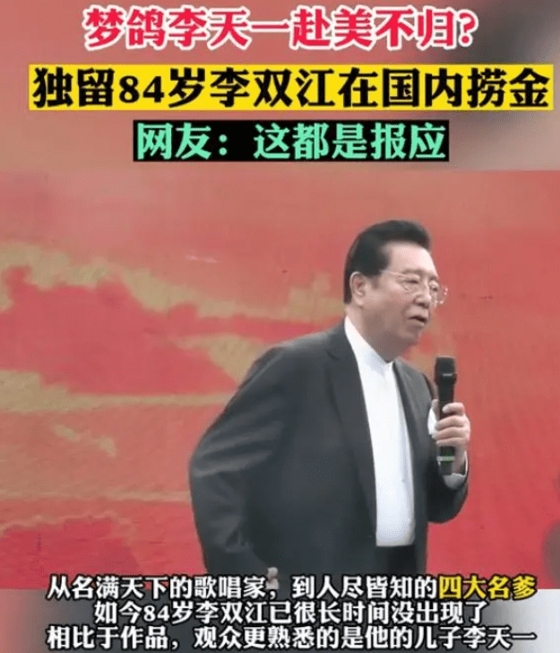 在他已经84岁的高龄下,李双江不得不演出以维持经济收入,尽管他曾是我国著名的男高音歌唱家,担任过解放军艺术学院音乐系主任、研究生导师,还担任过中央音乐学院和新加坡南洋艺术学院的客座教授。