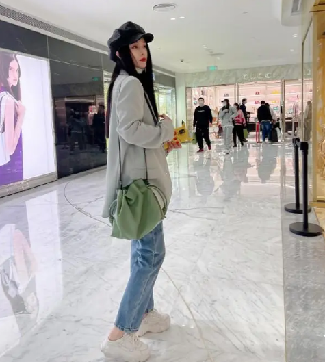 另外,她还选择了浅绿色的包包作为点缀。尽管是彩色的元素,但并不显得突兀,反而为整体造型增添了清新感,使整体造型更具减龄效果。