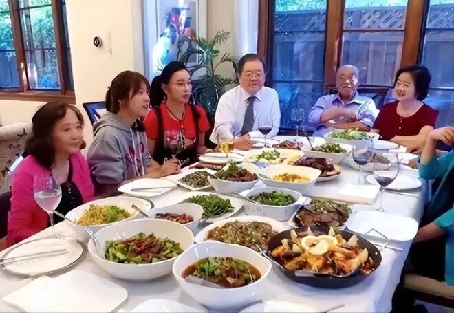 这是刘晓庆和她的丈夫在家中款待客人时拍摄的照片。刘晓庆穿着一件大红色短袖T恤,外面还披着一条围裙,可见她亲自下厨为客人烹饪,这些客人真是太幸福了!