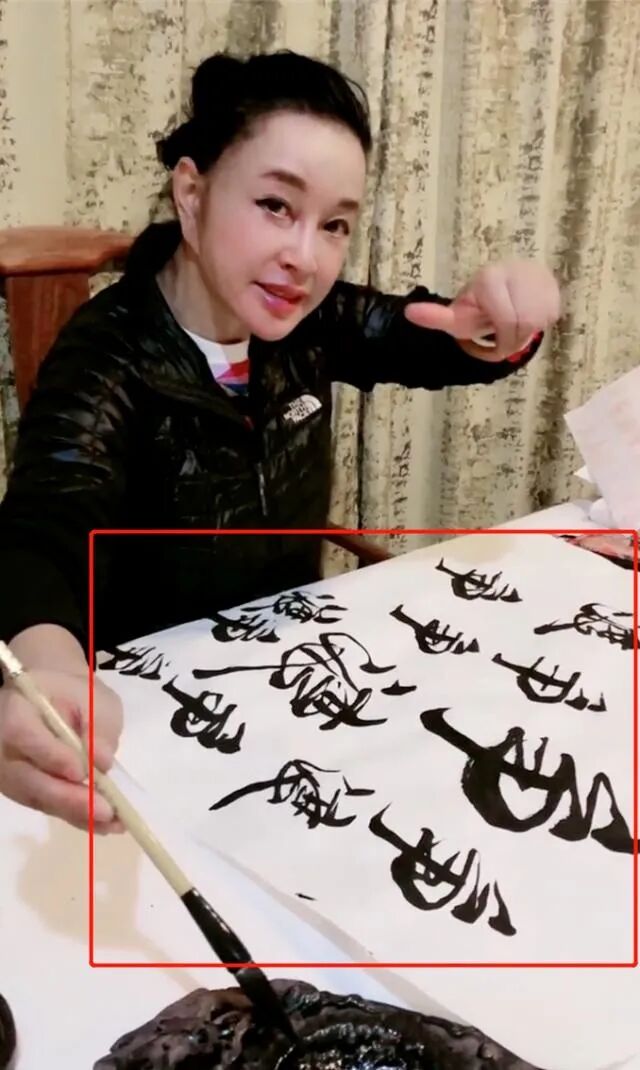 视频中展示了刘晓庆在家中练习书法的场景。她身穿一件普通的黑色羽绒服,内搭一件白底多彩印花T恤,头发高高扎起,后面扎了一个小髻。