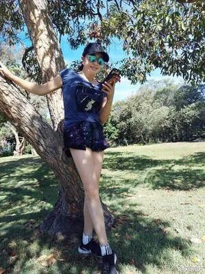 比如这张照片,她穿着蓝色泡泡袖T恤和超短裤子在公园散步,展现出修长而白皙的美腿,令人口水直流!年过70的她拥有如此少女般的双腿,实在令人羡慕!