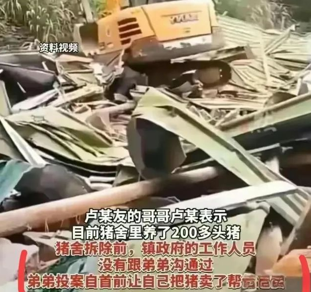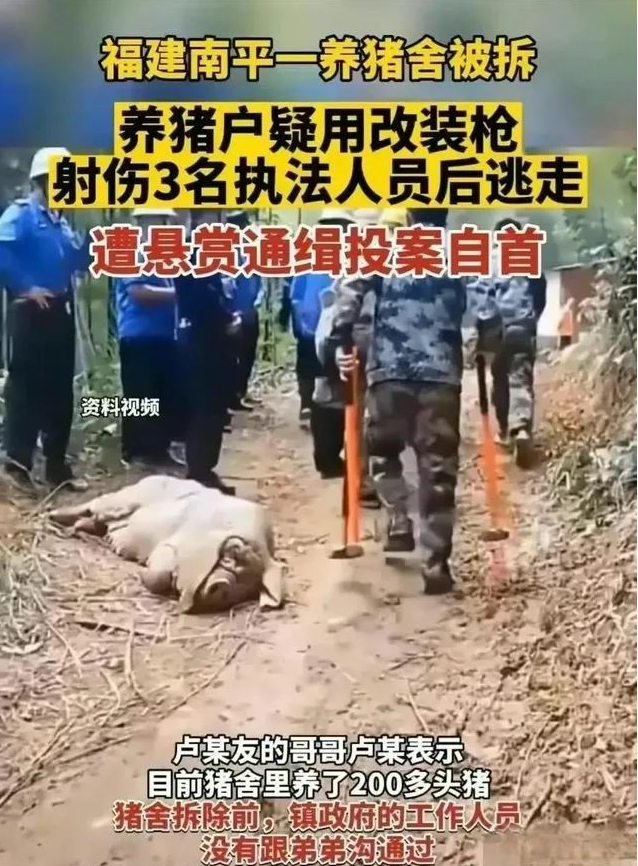 据报道,福建省南平市延平区的一位农民老卢,借了40万元资金兴建了一个养猪场。然而,在养肥了猪之后,他的猪舍突然遭到了60个城管的强行拆除。这些城管声称,老卢的猪舍是违章建筑,必须拆除,否则他们无法向上面交代。老卢对此感到十分崩溃,他表示自己并没有违法行为,也没有收到任何通知。在拆除过程中,老卢情绪失控,他寻找到一把射钉枪,朝着那些农场经理开枪,导致数人倒在地上。后来又承认说强拆卢某的猪场是拆错的。
