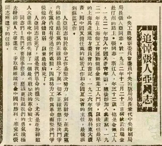 隆冬时节,张人亚赴闽西检查工作,途中翻越大山时不幸病倒,抢救无效身亡,年仅34岁。周恩来夫人邓颖超同志在《红色中华报》上发表悼文,其中写道:我们失去了一位最英勇坚决的革命战士。