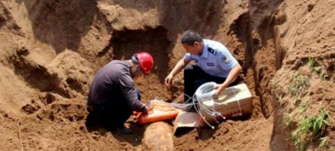 这时候,出现在人们视野中的,是一个沾满泥土的长椭圆形铁罐。村民们想把它抬走放到一边,却发现好几个人都搬不动。这时,有人开始担心这个铁罐可能是个炸弹。一石激起千层浪,村民们纷纷恐慌,迅速逃离挖掘现场。