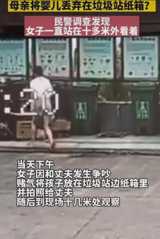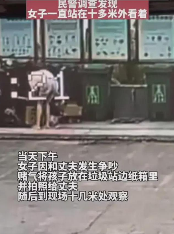事件发生后,很快就有好心的市民发现婴儿,并且报了警,辖区派出所人员赶到后调取了监控视频,并对这件事情做进一步调查。警察找到了躲在垃圾箱不远处的女子,当时女子居然一直站在10多米外的地方看着婴儿,作为母亲来说,怎么可以做出这种事情来,怎么能和丈夫吵架就把孩子扔了以此来气丈夫。