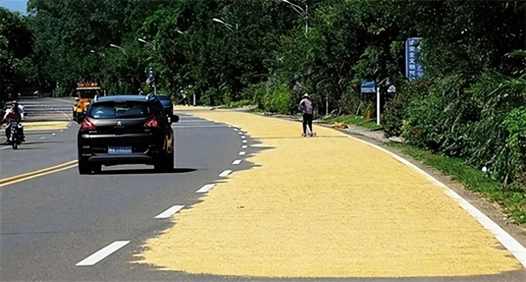 小道的路边都晒满了稻谷,阳光洒在路边晒干的稻谷上,犹如金色海洋。然而,这片宁静与幸福被一辆巨大的货车打破。货车因路面稻谷而打滑,发出震耳欲聋的巨响,蒋某的摩托车如飞鸟般冲向天空。