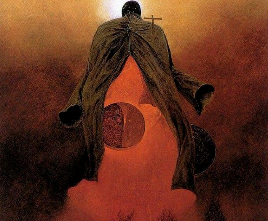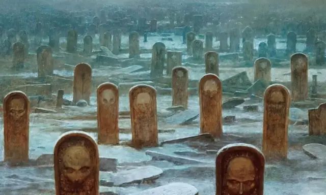 不被相信的贝克辛斯基决定将自己看到的画面都画出来,他凭借自己潜意识里的回忆,画出来一幅幅诡异的作品。这些作品的色调昏暗、气氛阴沉,画面的主题通常都是些骷髅、棺木、十字架,一些作品甚至出现了面目狰狞的奇怪物种,张着大嘴疯狂的吞噬着生灵。