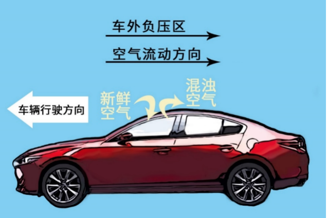 如果只开对角车窗,也就是左前+右后或者右前+左后,通过前窗进入车内的空气会与从后排进入车内的空气相互作用,产生一个小旋风。采用这种方式让车内空气更迅速流畅的循环排出,空气在车内流动也比较柔和。而且相对来说,这样开窗产生的风噪较低,通风效果不错,风阻也会低一些,是最推荐的开窗方式。