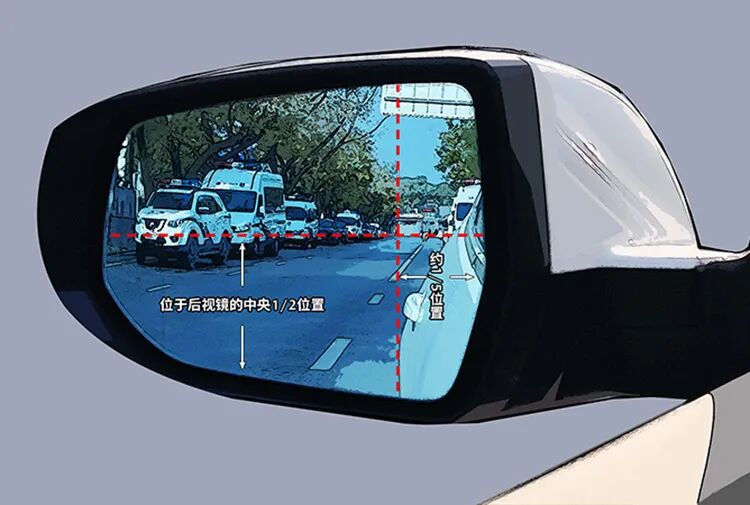 左侧后视镜调节方法:先调整镜片的左右位置,令左侧车身映像位于镜片右侧大约1/5位置;然后再调整镜片的上下位置,使地平线映像位于后视镜的中央1/2位置。这样调整后既能获得较大的视野范围,又能很好的帮你判断后方其他车辆与自身车辆的相对位置。