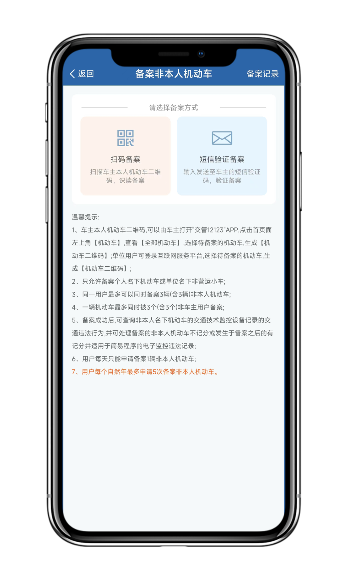 2、如果违章车辆是您亲朋好友名下的车辆,则需要先在APP中“备案非本人机动车”,这一步需要车主授权,备案通过后才可以进行违章处理。