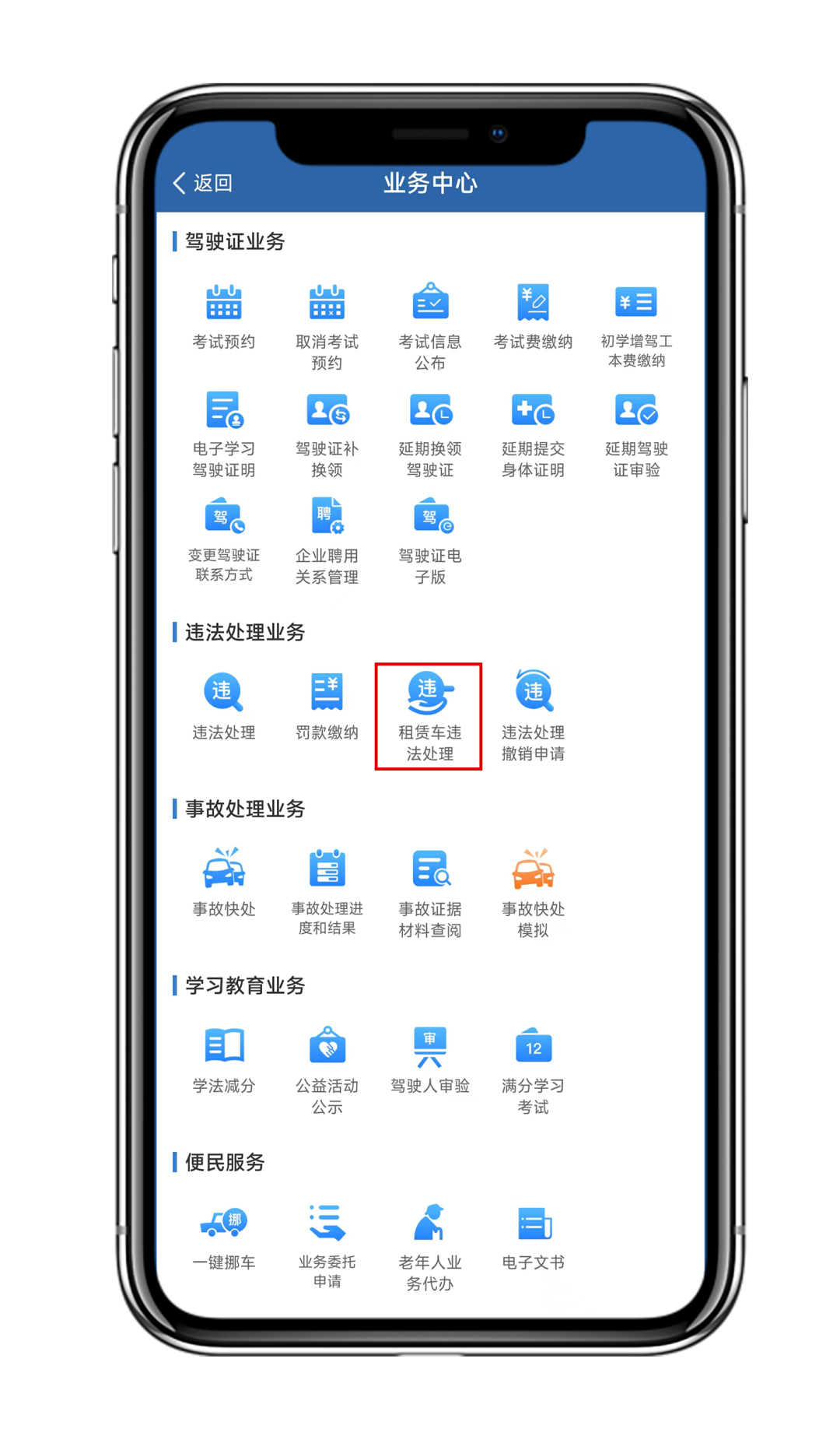 3、如果是驾驶租赁来的车辆发生了违法行为,则可以在APP中的“业务中心”项目下选择“租赁车违法处理”,进行违章处理和罚款缴纳。