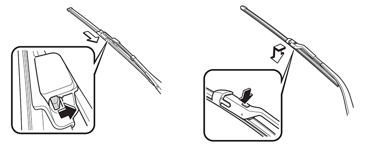 02 按住雨刮臂接头上凸起的按钮,按箭头方向从雨刮臂上拆下雨刮片(部分车型采用了通用U型雨刮臂接头,拆卸时抽出雨刮片的方向不同);