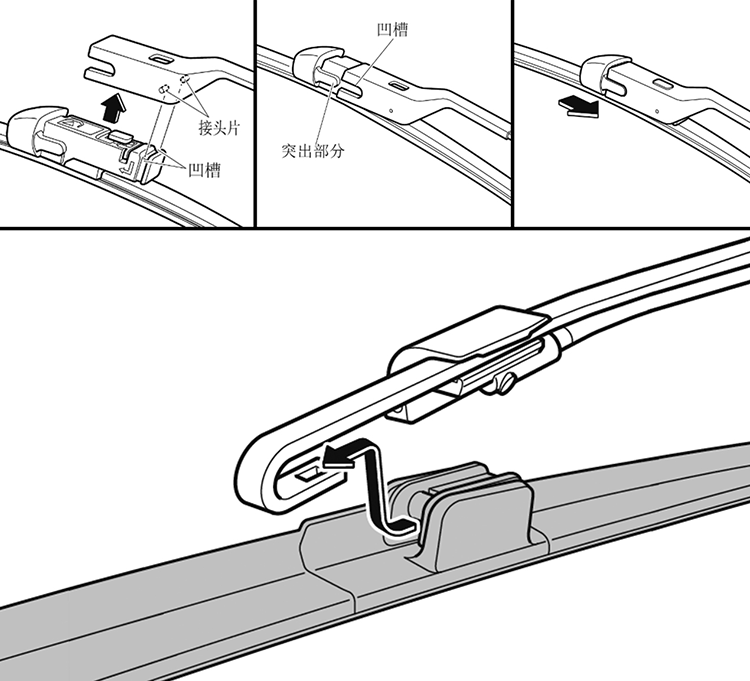 04 将新雨刮片上的突出部分与刮片臂的凹槽对齐,滑动雨刮片直至听到“咔哒”声,代表雨刮片已安装到位,此时可轻轻拉拔雨刮片,检查安装是否牢固。采用通用U型接头的雨刮臂,需将新雨刮片滑动至U型槽中;