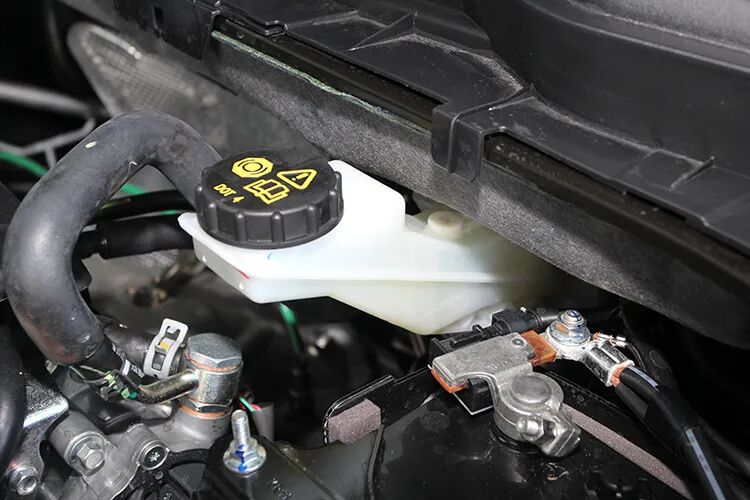 03 选择刹车油方法:打开发动机舱盖,找到刹车油储液罐,上面会有明确的标识告诉车主应该选择哪一个等级的刹车油。目前长安马自达在售的全部车型,均使用DOT4(即HZY4或Class4)等级的刹车油。