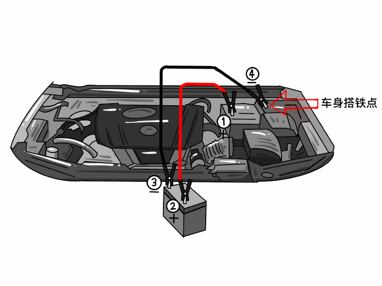 ④连接亏电车辆发动机舱内的车身搭铁点;