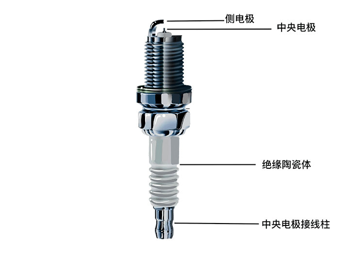 火花塞的中心电极是正极,工作时表面有上万伏的高电压,被绝缘的陶瓷材料包裹;侧电极通过螺纹固定在缸盖上,与发动机搭铁相连,相当于连接蓄电池的负极。发动机需要点火时,高电压便会击穿火花塞中心电极与侧电极之间的空气,形成火花点燃混合气(原理和我们见到的闪电类似)。