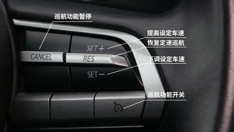 定速巡航的操作,主要是通过多功能方向盘上的几个功能键来实现的。如下图所示,右下角的开关按键用于开启和关闭巡航功能;“SET+”和“SET-”键用来设定车速,车辆巡航时会以设定的车速行驶;“CANCEL”按键用于暂停巡航功能;“RES”按键用于在暂停巡航或踩制动后,让巡航功能再次激活。