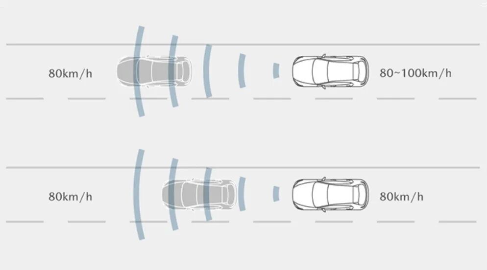 根据车辆配置的不同,巡航功能可分为“定速巡航”和“自适应巡航”两类。定速巡航激活后可以让车辆以驾驶员设定的车速行驶,但不具备自动减速功能;自适应巡航不仅可以按照驾驶设定的车速行驶,还能在前方车辆减速时主动制动,以及在前方车辆速度低于驾驶员设定车速的情况下,保持与前车速度相同进行跟车行驶。如果前车加速行驶,自适应巡航也会为车辆提速,直至达到驾驶员设定的车速。