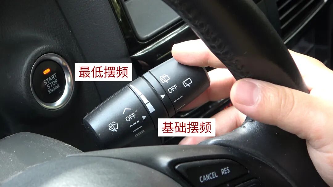 雨刷频率调节环上有代表刮水频率的标记,标记线的宽度越窄,刮水频率越低。且车辆在出厂时,会默认将雨刷频率调节环放置在标记线最宽的位置,即视频中的“基础摆频”。