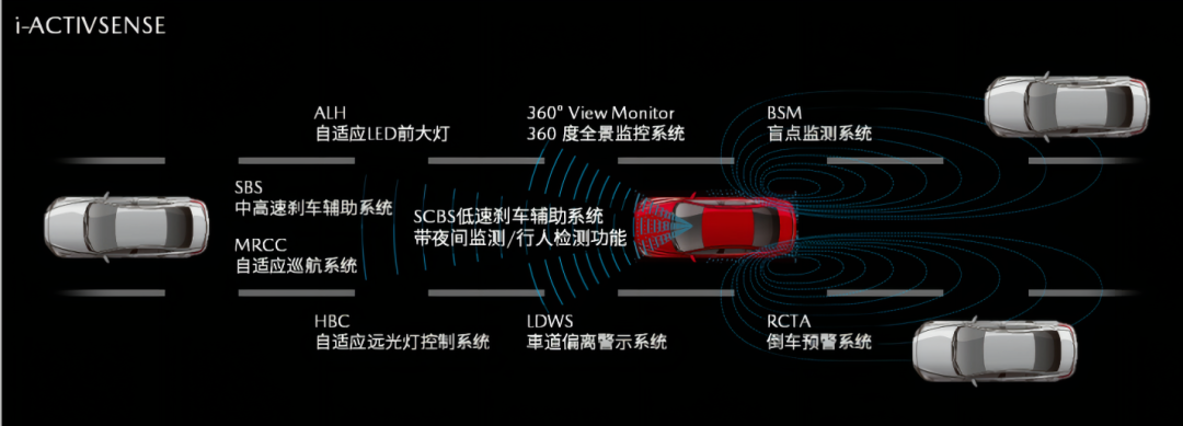 i-ACTIVSENSE系统包括:ALH自适应LED前大灯、AFS前大灯智能弯道辅助照明、360°全景监控、BSM盲点监测、RCTA倒车预警、MRCC自适应巡航、RVM后方车辆监测、FOW前方碰撞预警、SCBS低速刹车辅助,以及SBS中高速刹车辅助等。当i-ACTIVSENSE警告信号灯点亮时会暂时禁用i-ACTIVSENSE功能。