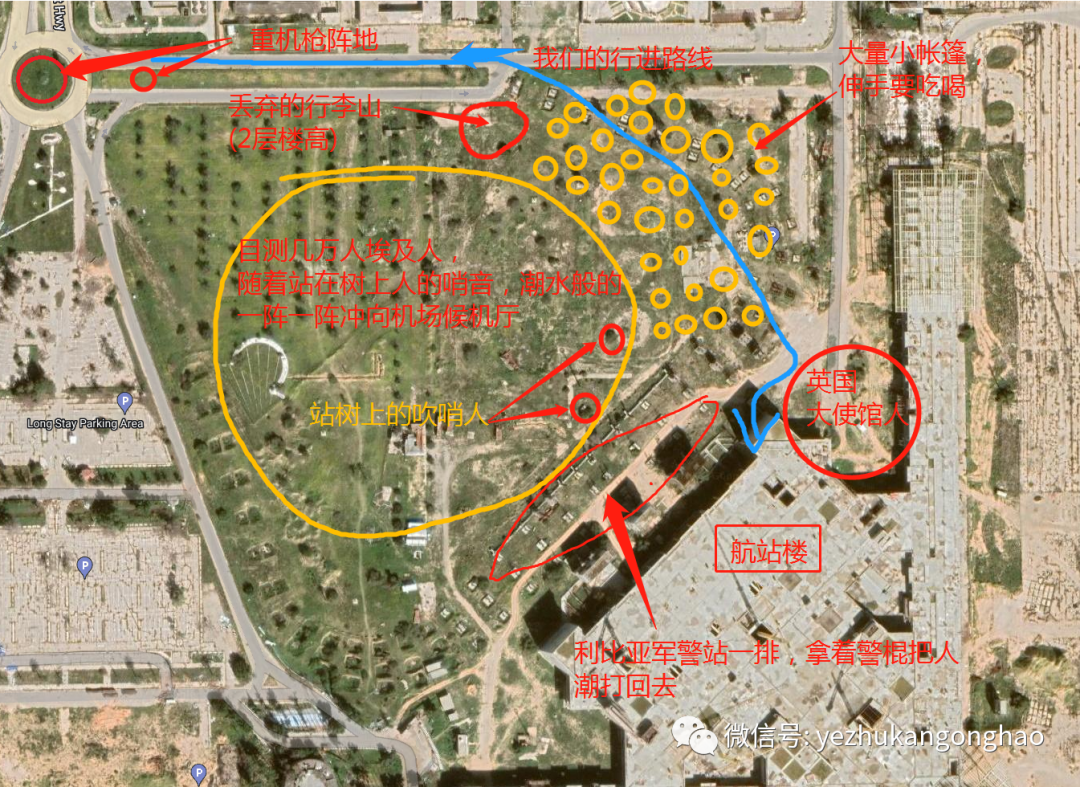 之后走到航站楼外,我们和英国大使馆及其侨民在一个位置,就是图上右中的位置,这时我见到了让我非常震惊的一幕