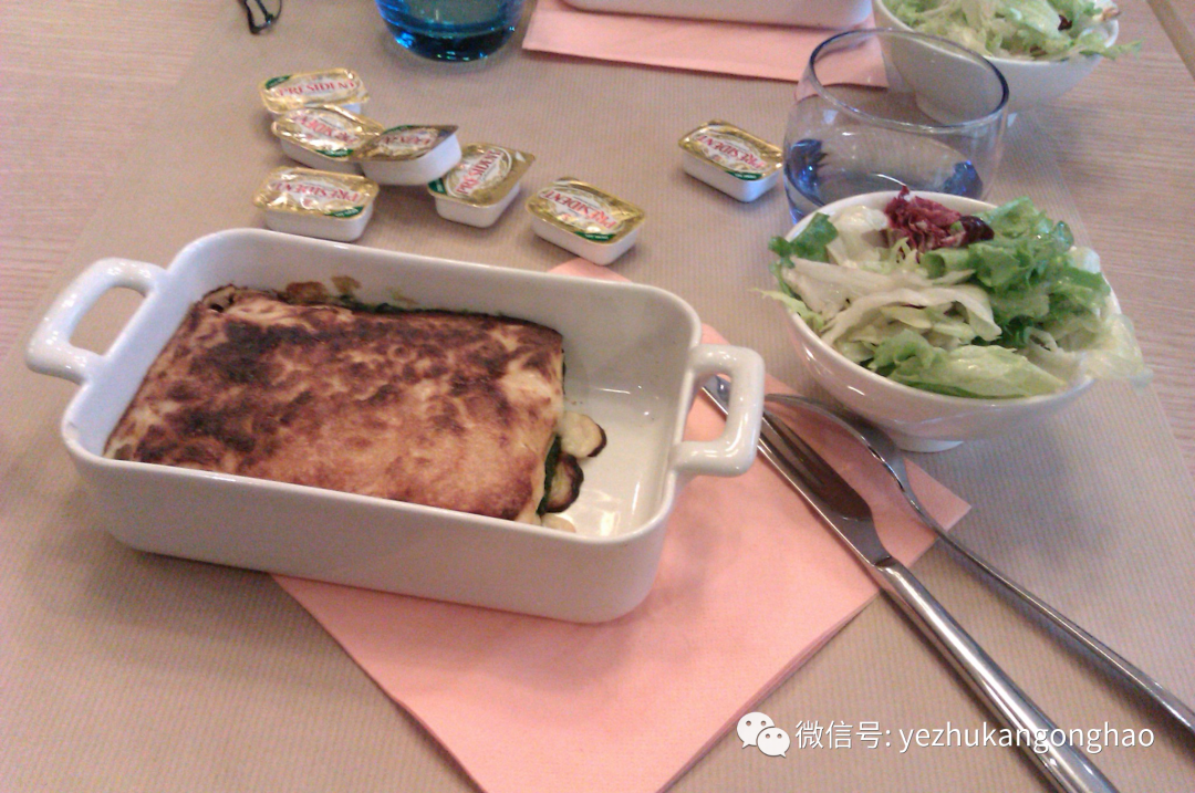 于是大家各自预订商业航班回国,我定了到深圳的航班在下午,所以上午还在这个酒店的餐厅吃了一顿饭,菜单看不太懂,点了一个最便宜的10欧元,端上来一看应该是一个奶酪焗饭,还有一小碗沙拉