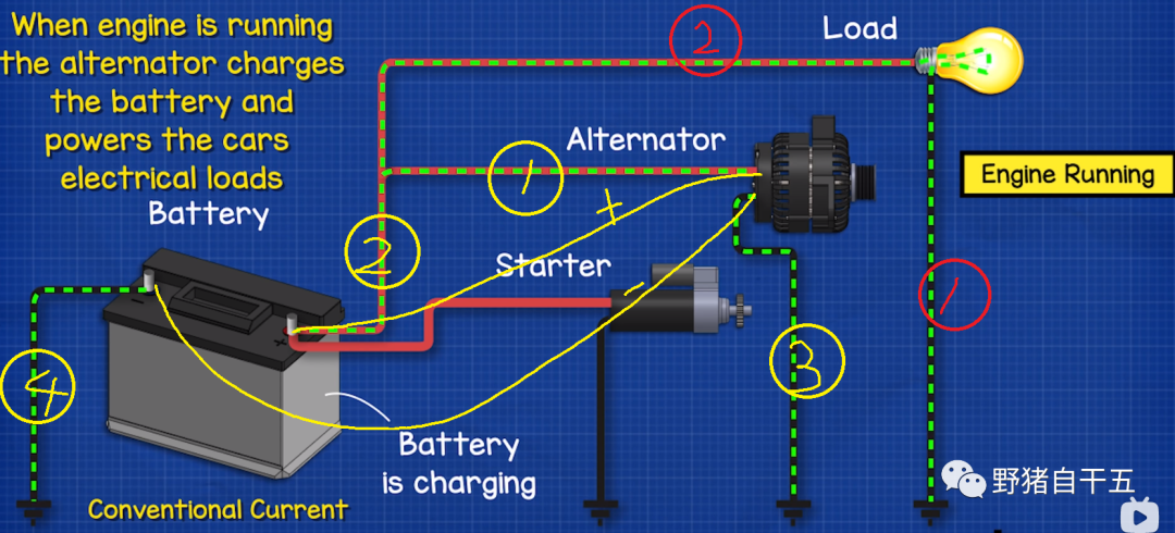 汽车发动机启动后,车内所有的电器供电均由发电机供电