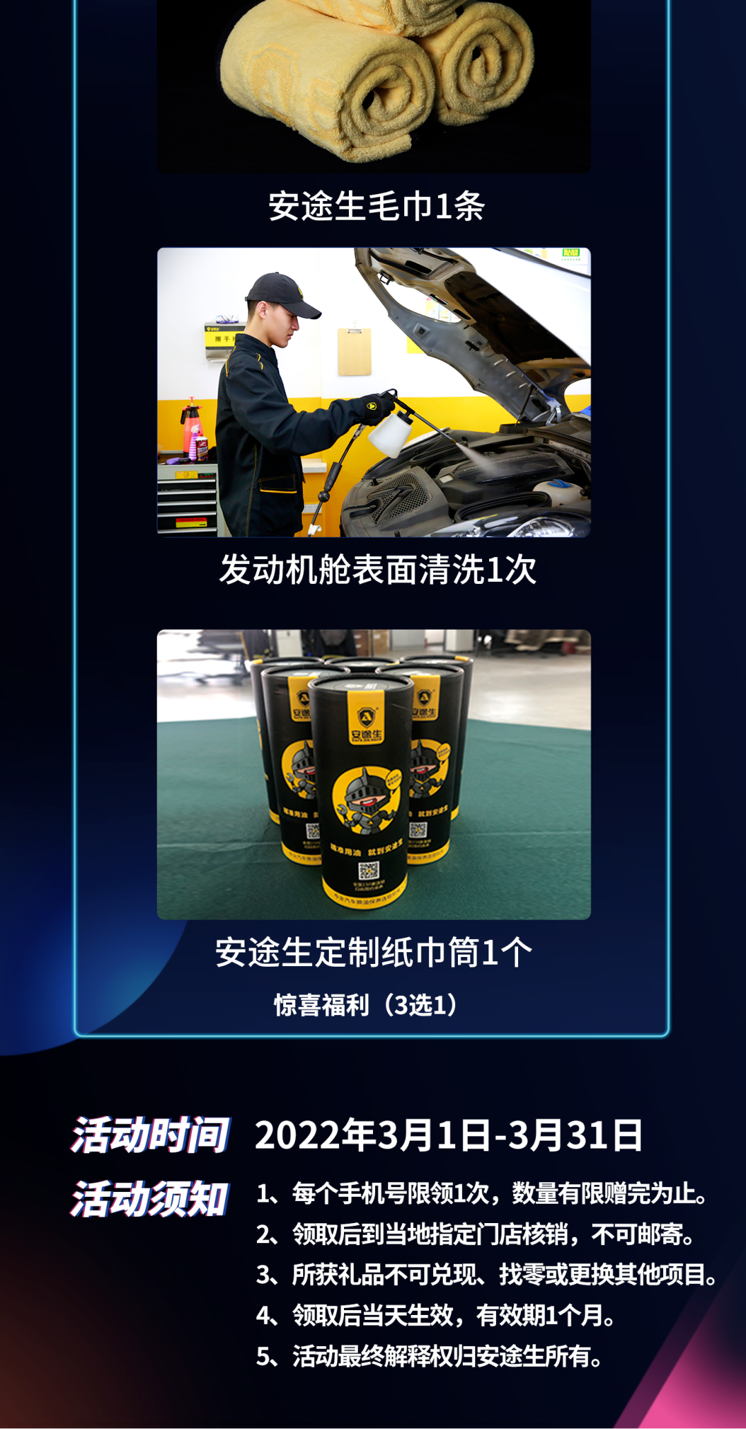 感谢安途生专业换油保养中心对本次活动的大力支持!活动项目由企业提供服务,并保留对项目的解释权。
