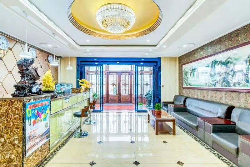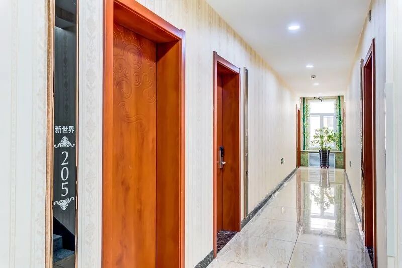 上面这三张是宾馆的外景、接待大厅和走廊的图片。这个宾馆位置在哈尔滨道里区太平镇先富村。在高德导航里面可以搜到,搜索关键词是:新世界宾馆太平机场店。