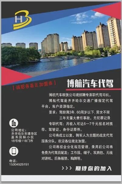 齐市的代驾公司现在有好几家了,博航代驾已经上线运营了一段时间,因业务量增加迅速,现决定继续招聘代驾司机。