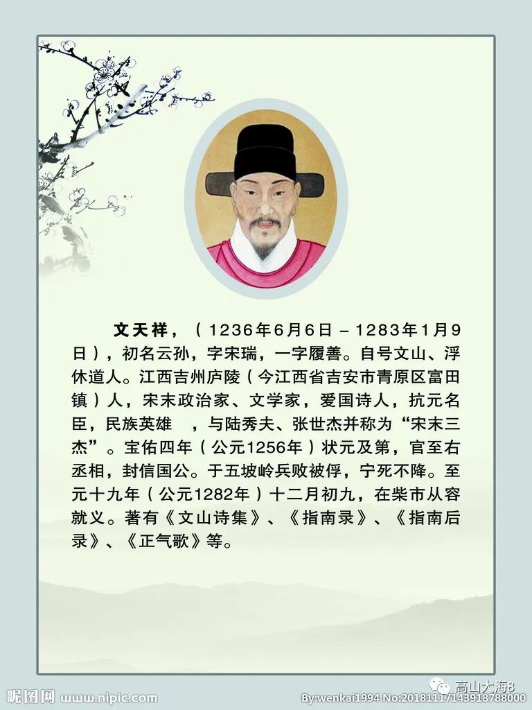 文天祥(1236年6月6日-1283年1月9日),初名云孙,字宋瑞,一字履善。自号文山、浮休道人。江西吉州庐陵(今属江西吉安)人,宋末政治家、文学家,爱国诗人,抗元名臣,与陆秀夫、张世杰并称为“宋末三杰”。宝祐四年(公元1256年)状元及第,官至右丞相,封信国公。于五坡岭兵败被俘,宁死不降。至元十九年(公元1282年)十二月初九,在柴市从容就义。著有《文山诗集》、《指南录》、《指南后录》、《正气歌》等1000余首诗词作品。