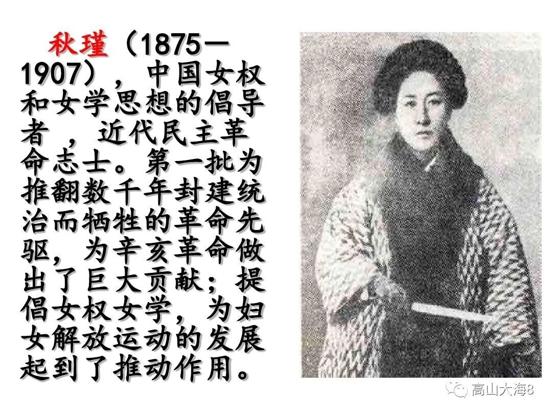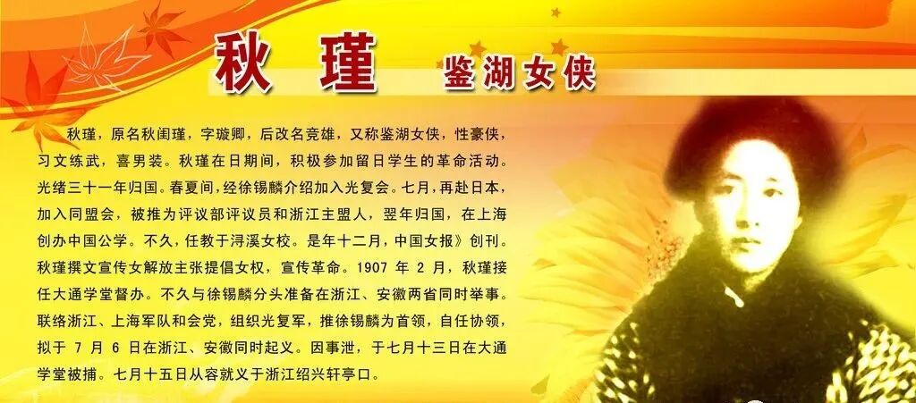 秋瑾是为推翻数千年封建统治而牺牲的女烈士,为辛亥革命做出了巨大贡献;提倡女权女学,为妇女解放运动的发展起到了巨大的推动作用。1907年7月15日凌晨,秋瑾从容就义于绍兴轩亭口。