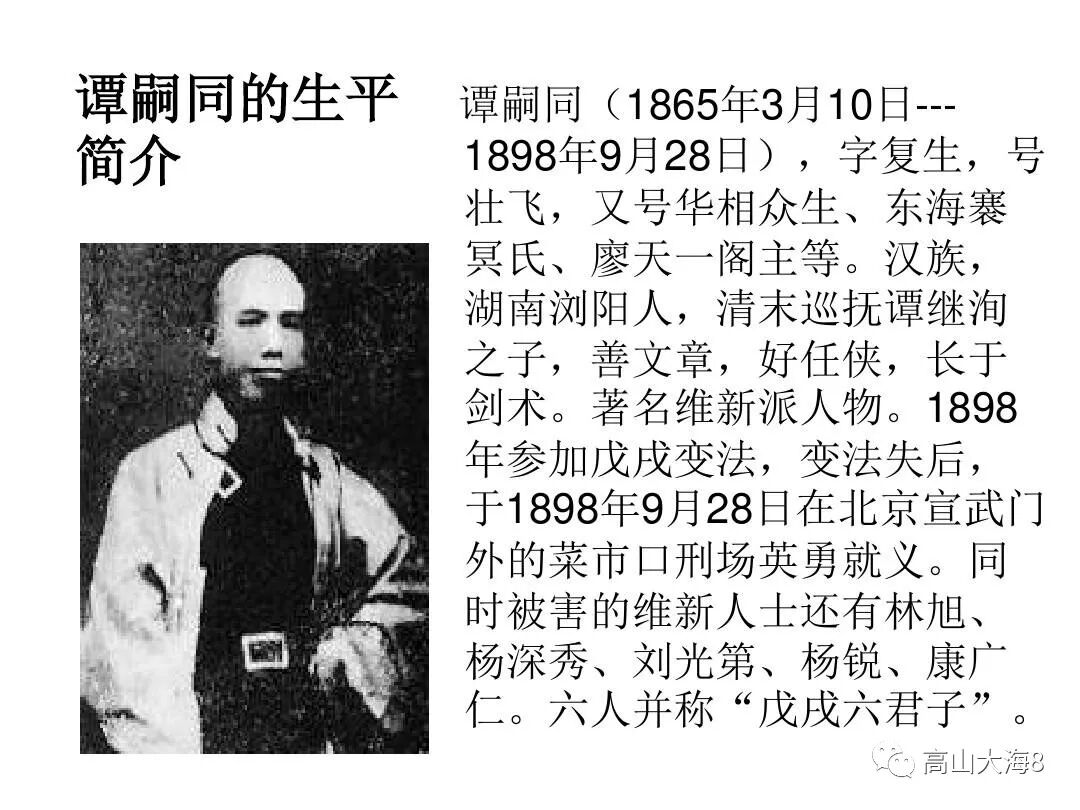 光绪二十四年(1898年),谭嗣同参加领导戊戌变法,失败后被杀,年仅33岁,为“戊戌六君子”之一。