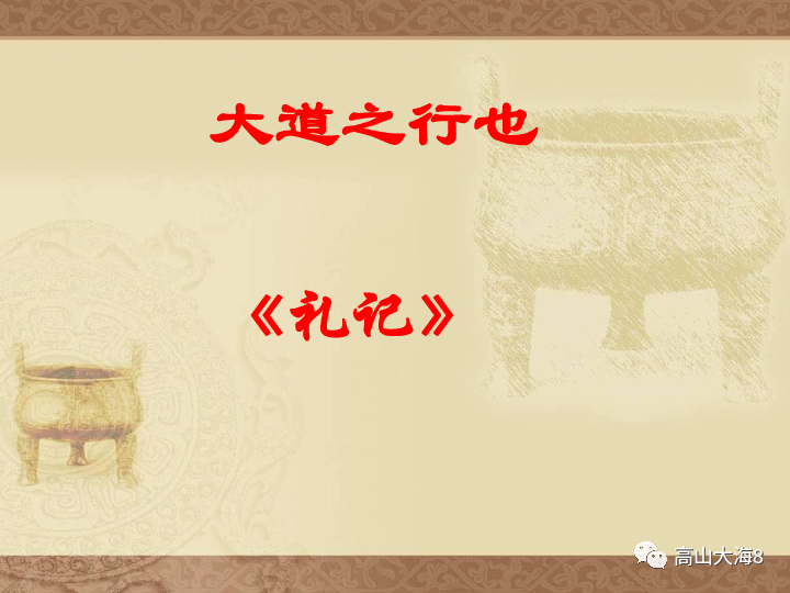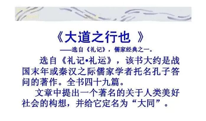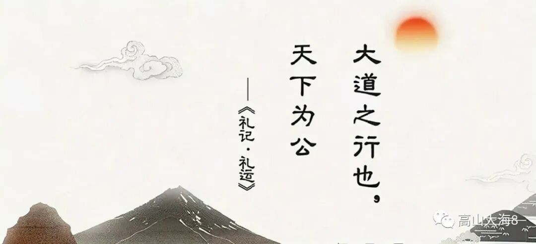 【赏析】“天下为公”,是相对于“天下为家”的概念。“天下为家”,即天子以天下为家,天子之位传于其子孙,以天下为私有。“天下为公”,这是儒家所设想并憧憬的“大同世界”。在这个理想的世界里,天子是禅让的,执政官员都是公选出来的贤能之人,社会上人们和睦相处,亲如一家,社会的每一个成员均有所养、所用、所终,没有奸诈的小人,盗贼绝迹,夜不闭户……这就是孔子所描绘的“大同世界”的情景。