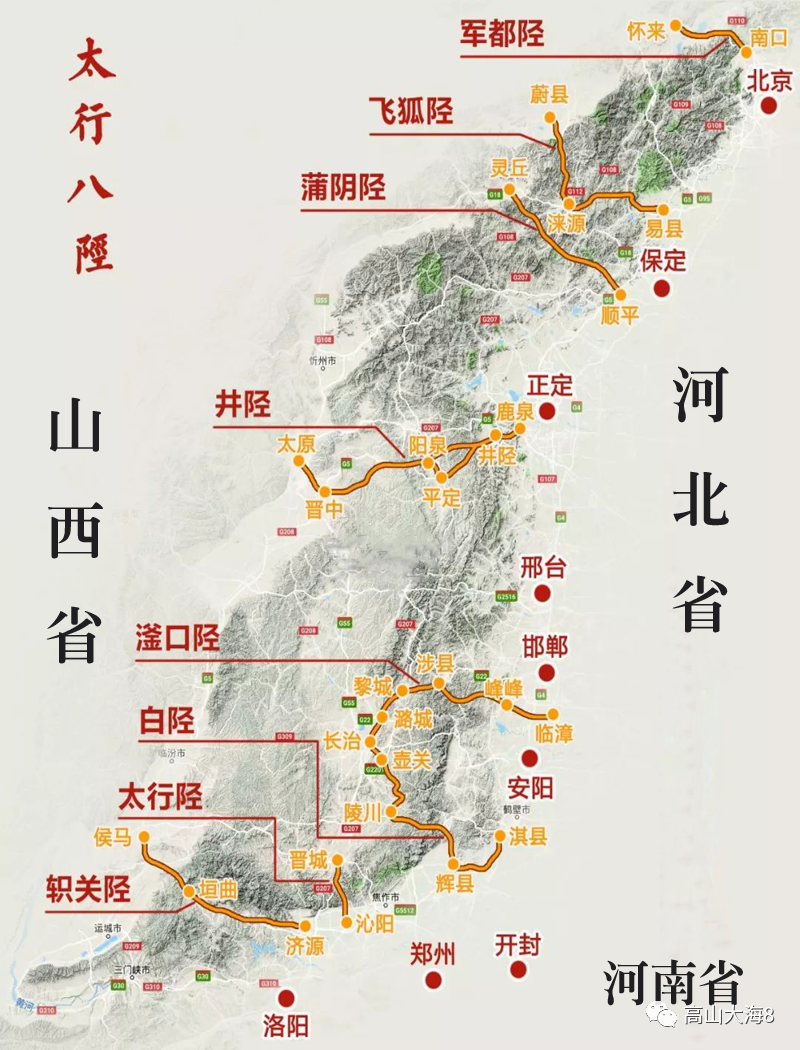 太行八陉,陉,音xíng,即山脉中断的地方。太行山中多东西向横谷(陉),著名的有:军都陉、蒲阴陉、飞狐陉、井陉、滏口陉、白陉、太行陉、轵关陉等,古称太行八陉,即古代晋冀豫三省穿越太行山相互往来的8条咽喉通道,是三省边界的重要军事关隘所在之地。