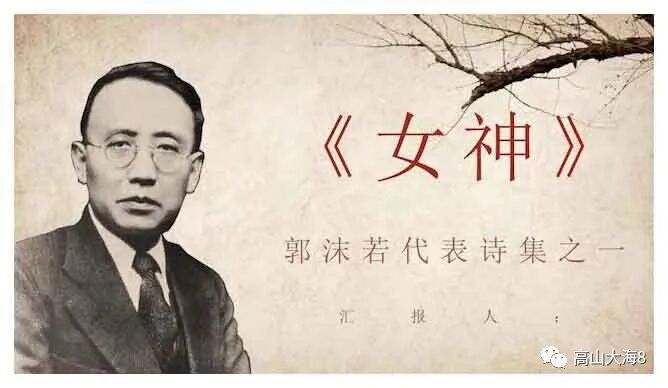 郭沫若(1892一1978),原名开贞.别号鼎堂,四川乐山人。1914年赴日本留学,1916年开始自话新诗创作.1921年出版诗集《女神》,成为中国现代新诗的奠基之作,反映狂飙突进的“五四”时代精神。此外还著有诗集《星空》(1923)、《瓶》(1925)、《前茅》(1928)等,戏剧代表作《屈原》、《虎符》等。他留下了浩瀚的文学著作。他的文体,常有可挑剔的地方;他的作品,并不都能经受时间的销磨。但他在文学史上的地位是不可动摇的。继鲁迅之后,他成为中国进步文学的又一面旗帜。他的作品中有激荡的力量、饱酣的气势和洒脱的风度。中国现代作家中,没有人能达到他的精神强度。