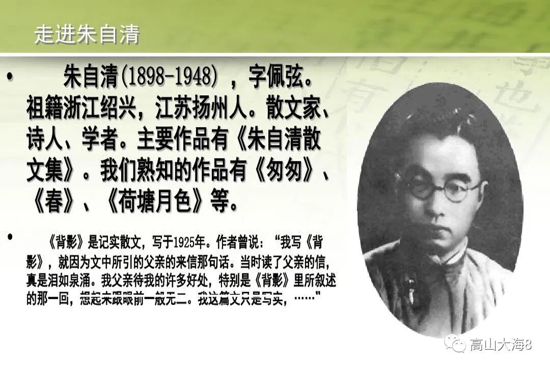 朱自清1912年入高等小学,1916年中学毕业后考入北京大学预科,改名为朱自清,原因是先生入北大读预科之时,家境困窘,欲自己承担学费,而且准备提前结束预科学习,故改名为自清,为自理之意。他是五四爱国运动的参加者,受五四浪潮的影响走上文学道路。1919年2月写的《睡罢,小小的人》是他的新诗处女作。