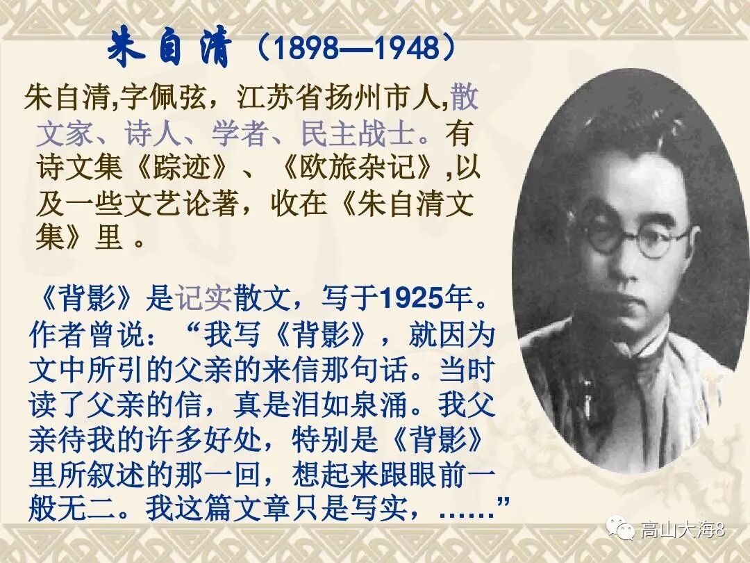 1920年北京大学哲学系毕业后,在江苏、浙江一带教中学,积极参加新文学运动。1922年和俞平伯等人创办《诗》月刊,是新诗诞生时期最早的诗刊。他是早期文学研究会会员。1923年发表长诗《毁灭》,震动诗坛;这时还写过《桨声灯影里的秦淮河》等优美散文。1925年8月到清华大学任教,开始研究中国古典文学;创作则以散文为主。1927年写的《背影》、《荷塘月色》都是脍炙人口的名篇。1931年留学英国,漫游欧洲,回国后写成《欧游杂记》。1932年9月任清华大学中文系主任。1937年抗日战争爆发,随校南迁至昆明,任西南联大教授,讲授《宋诗》、《文辞研究》等课程。这一时期曾写过散文《语义影》。1946年由昆明返回北京,任清华大学中文系主任。1947年,朱自清在《十三教授宣言》上签名,抗议当局任意逮捕群众。