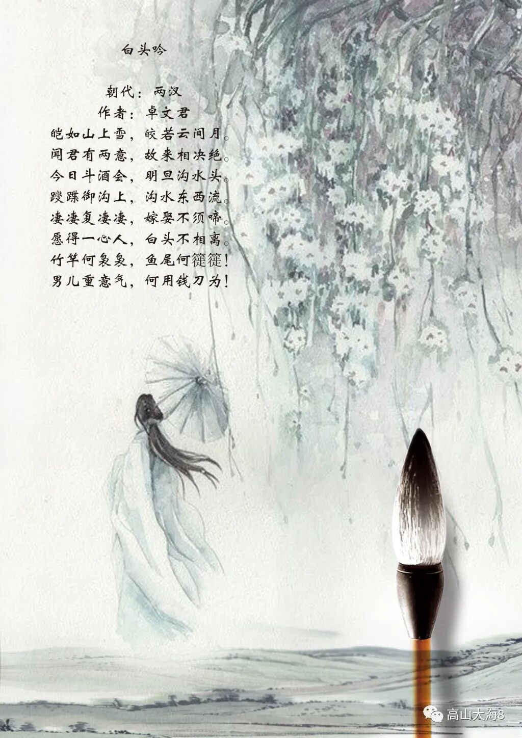 《白头吟》是一首汉乐府民歌,属《相和歌辞》,有人认为是汉代才女卓文君所作,但存有较大争议。其中“愿得一心人,白首不相离”为千古名句。此诗通过女主人公的言行,塑造了一个个性爽朗,感情强烈的女性形象,表达了主人公失去爱情的悲愤和对真正纯真爱情的渴望,以及肯定真挚专一的爱情态度,贬责喜新厌旧、半途相弃的行为。