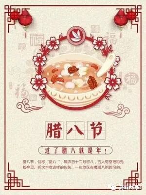 腊八节,每年农历的十二月初八,在那一天,老百姓就会吃腊八粥等传统的食品来庆祝,这种习俗在我过已经有很久远的历史,人们会到比较有名的庙宇拜神,以驱邪避鬼,求家人一年的平安。