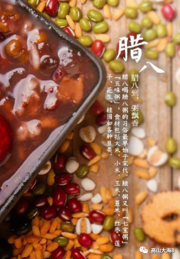 说去腊八节必不可少的一项食物——腊八粥,中国各地腊八粥的花样,争奇竞巧,品种繁多。其中以北平的最为讲究,搀在白米中的物品较多,如红枣、莲子、核桃、栗子、杏仁、桂圆、榛子、松仁、白果、葡萄、菱角、青丝、红豆、玫瑰、花生……总计不下二十种。中国有着这个传统,就是在腊月初七的晚上,就开始忙碌起来,洗米、泡果、拨皮、去核、精拣然后在半夜时分开始煮,再用微火炖,一直炖到第二天的清晨,腊八粥才算熬好了。