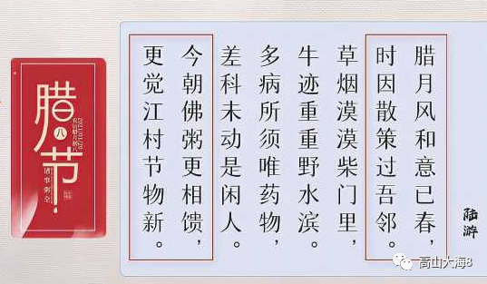 腊月初八腊八粥,在十二月初八时候,在腊八节里,我国有着食用腊八粥的习俗。腊八粥是用八种当年收获的新鲜粮食和瓜果煮成,一般都为甜味粥。而中原地区的许多农家却喜欢吃腊八咸粥,粥内除大米、小米、绿豆。