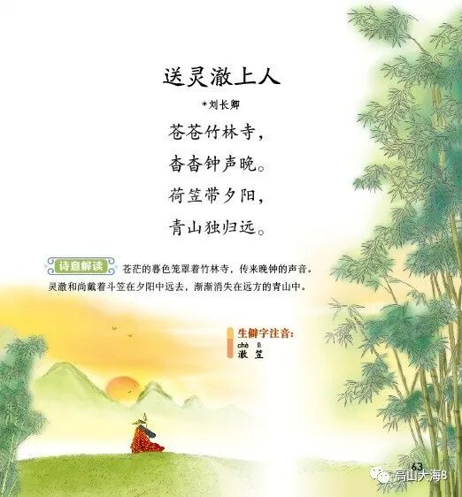 苍翠竹林掩映着竹林寺,远远地,传来寺中的晚钟声。灵澈背着斗笠,在夕阳的映照下,沿着青山独自走向远方。
