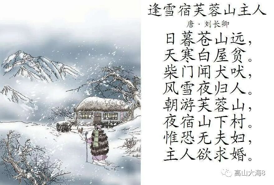“日暮苍山远,天寒白屋贫。柴门闻犬吠,风雪夜归人。”短短20个字是一幅风雪夜归图,孤寒清妙,令人回味无穷。