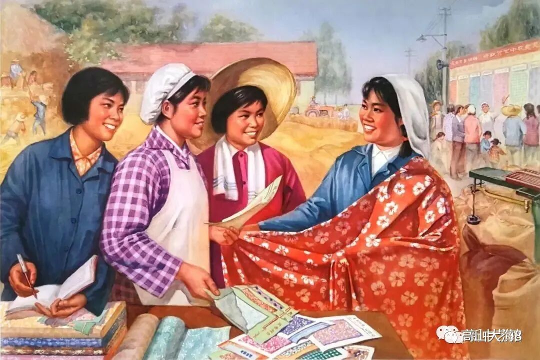 13、1960年代出版的《丰收场上披新装》年画,作者是周云根,丰收的时节,粮站里堆满了稻谷,供销社送货上门销售,直接将布料摆到了晒谷场,女社员们披上了红色的布匹,试着样式,脸上露出了幸福的笑容。