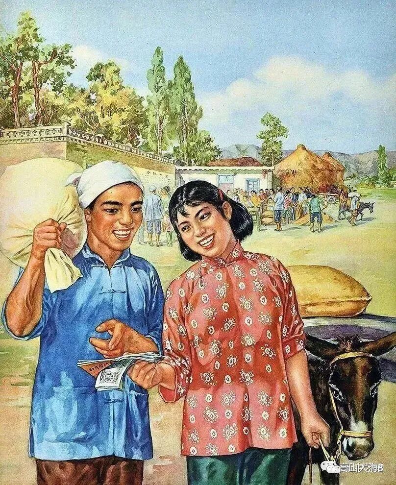 6、1962年出版的《按劳分配,多劳多得》年画,作者是高汝法,在收获之后,忙碌了一年的社员们迎来分配的时候,一对年轻的社员夫妻,丈夫扛着粮食,妻子牵着驴子,一手拿着厚厚的人民币,喜笑颜开。