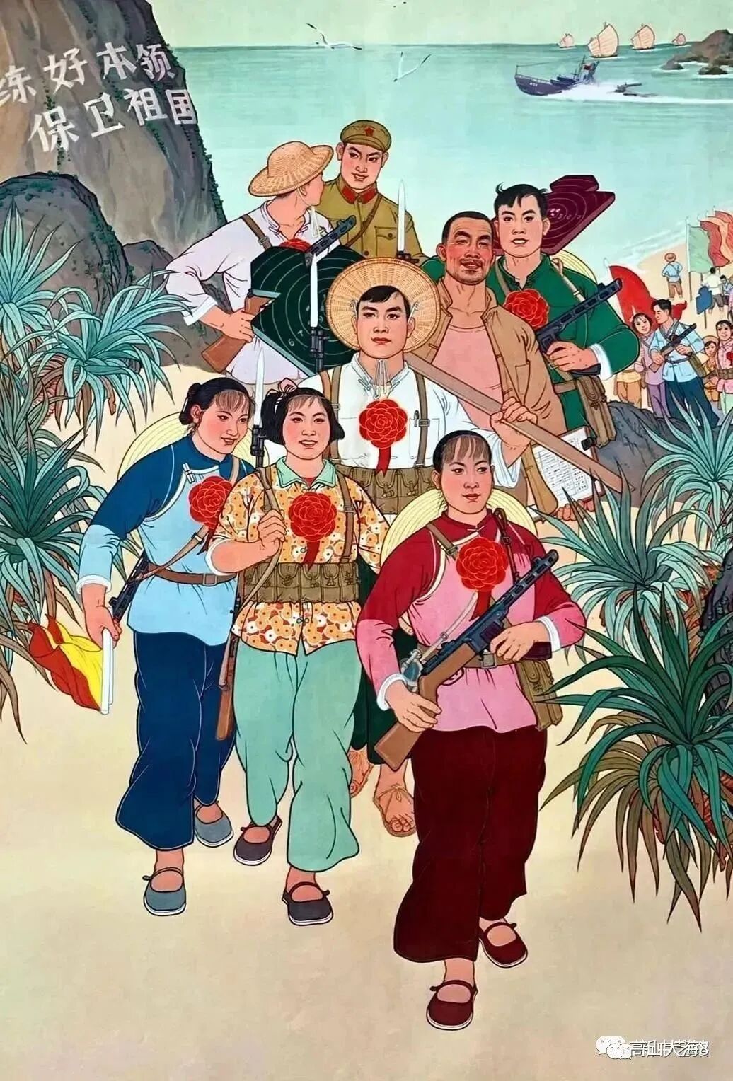 1、1965年出版的《苦练硬功夫争当神枪手》年画,作者是陈政明、陈政趾,在海岛的沙滩,行进着一支全副武装的队伍,那是解放军战士帮助渔村民兵训练,走在前面的几人迈着矫健的步伐,胸口戴着大红花,那是打靶之后的神枪手们。