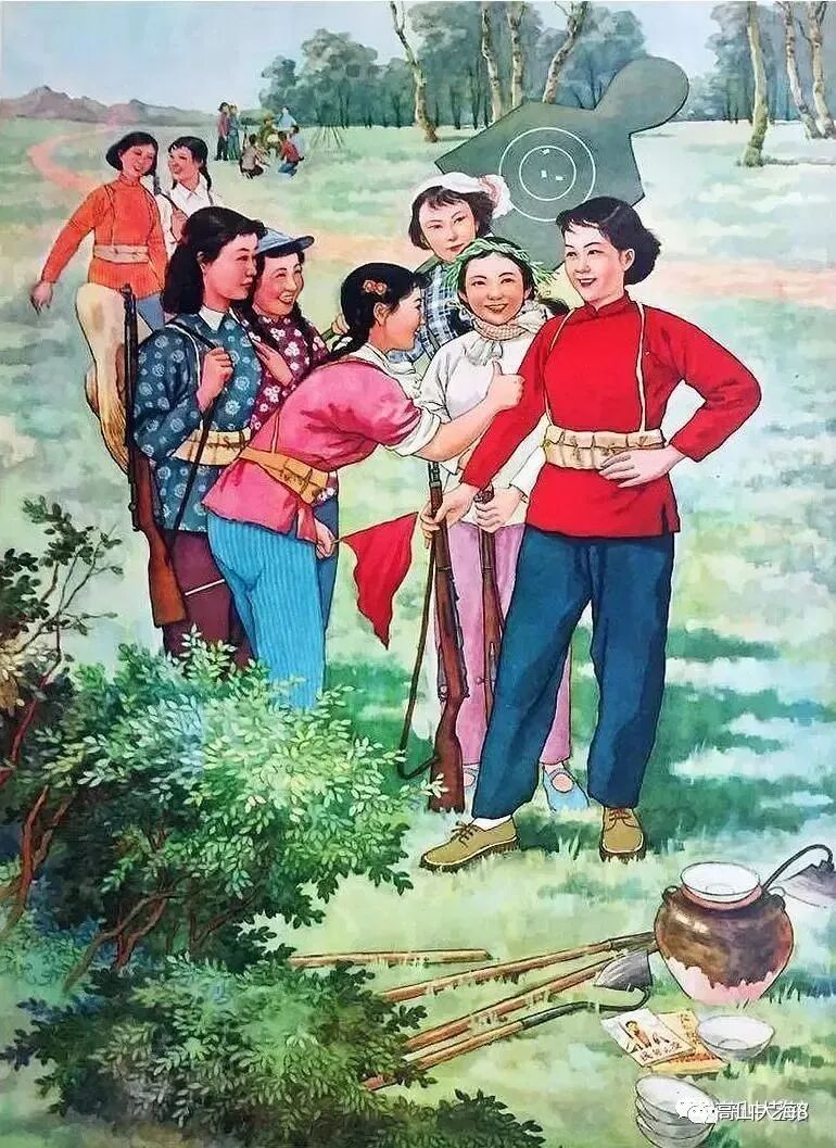 15、1963年出版的《女民兵》年画,作者是陈永智,在野外的林地旁,这是一处训练场,一群年轻的女民兵提着枪,扛着打过的靶子,大家纷纷向穿红衣的女子祝贺,从3颗子弹都是10环,可见她的枪法极准。