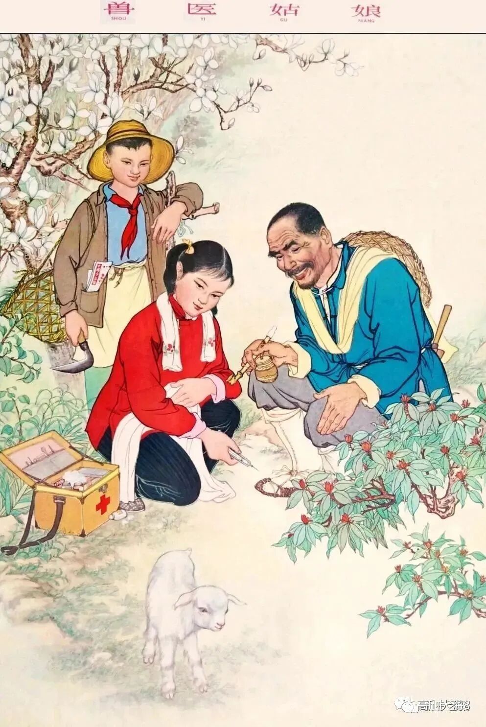 12、1964年出版的《兽医姑娘》年画,作者是胡振郎,在空地上,蹲着一位红衣姑娘,她是一位年轻的兽医,手里拿着针管,在一旁的大叔注视下,正准备给小羊羔打针。